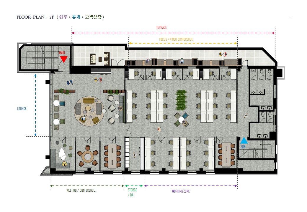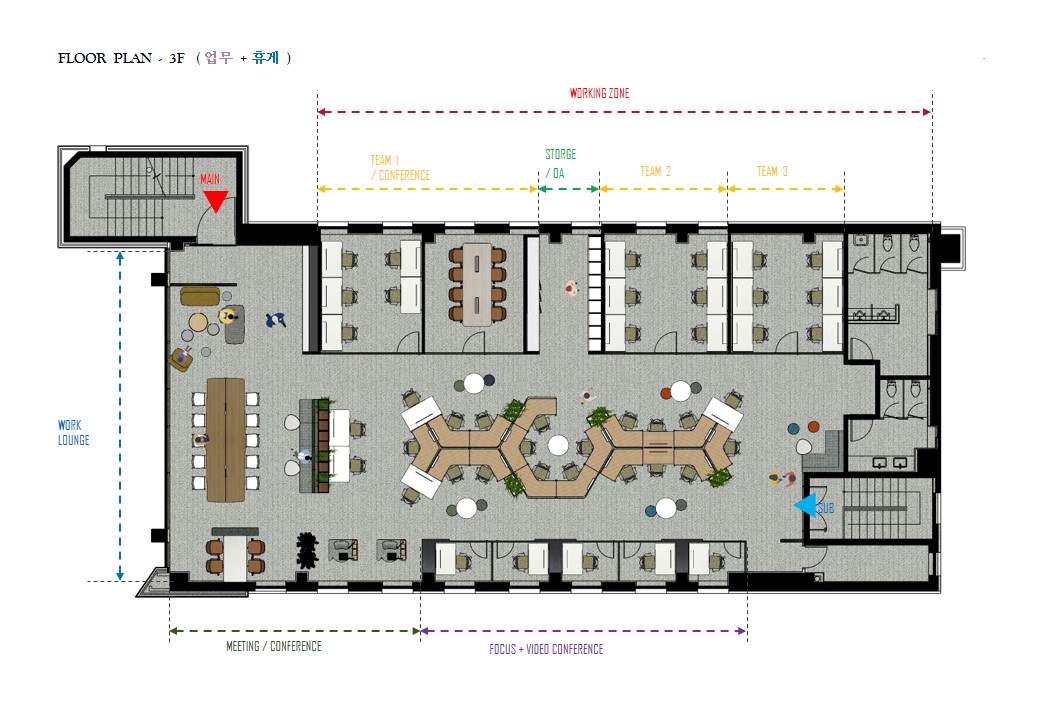 이렇게 2개층으로 나눠서 공간마다의 특성을 넣어서 공간을 디자인 했으며 크게는 하나의 공간이지만 각각의 공간에서 구성원들이 업무공간과/ IT 공간에서는 정보를 충전하고 휴게공간에서는 휴식을 충전하며 워크라운지에서는 에너지를 충전 할 수 있도록 공간의 흐름을 유도하였습니다.