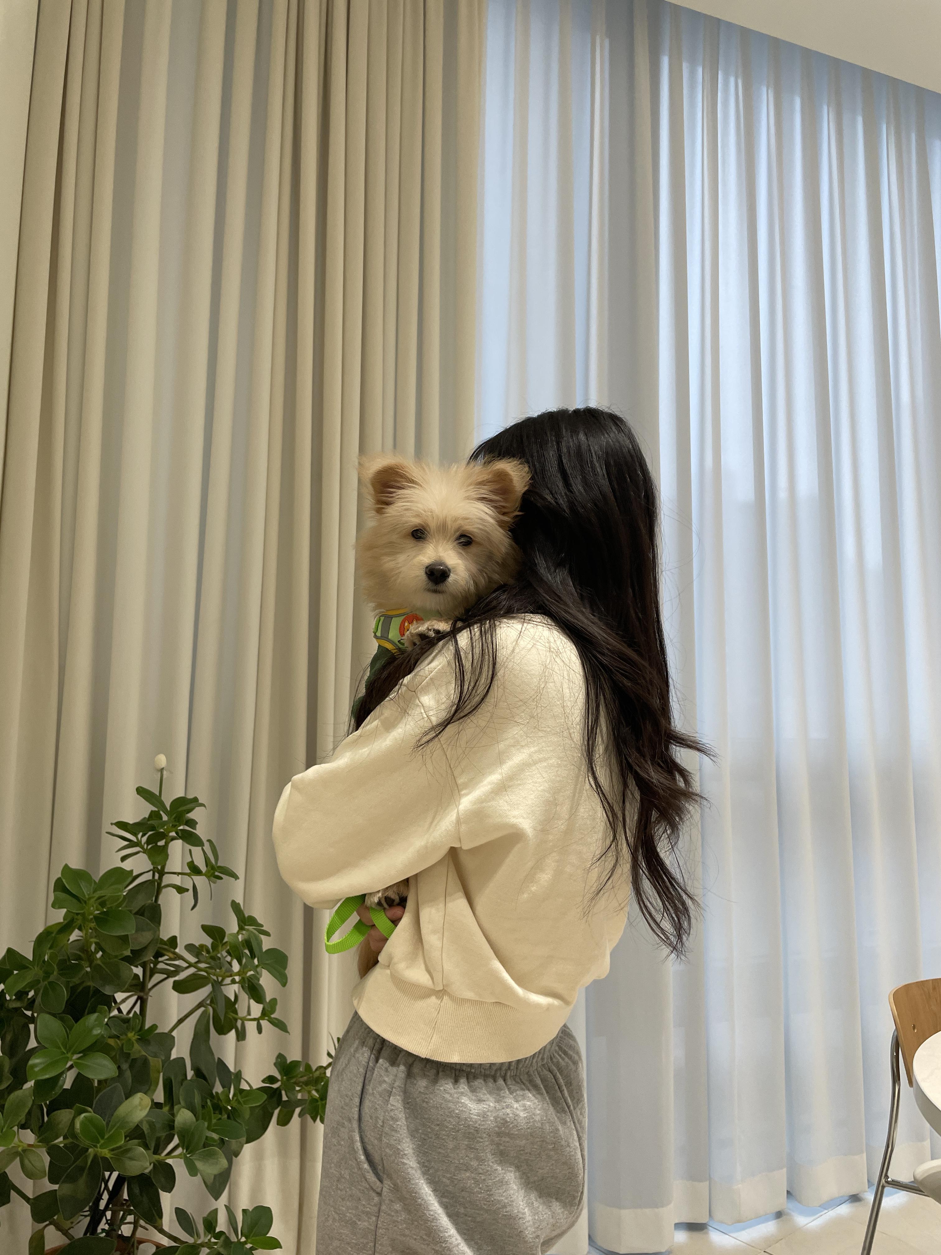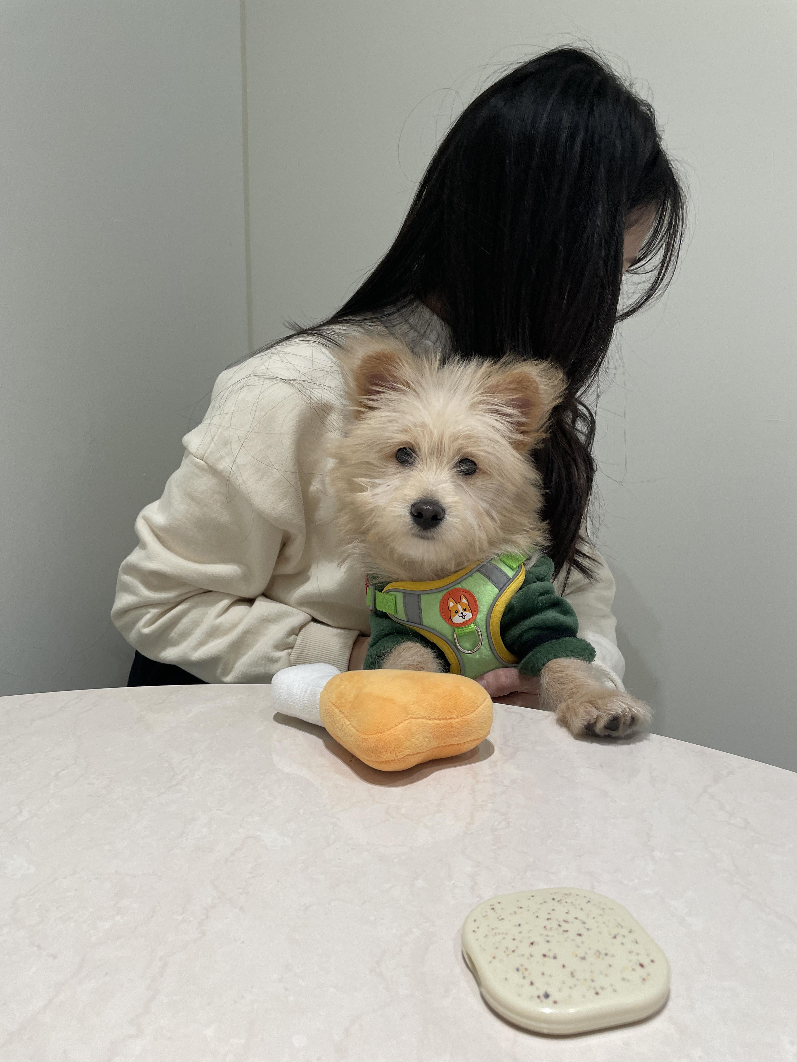 룽지는 겁이 많아서 처음에는 카페가 약간 어색하고 익숙하지 않아서 여자친구 품에 계속 안겨 있었어요!! 달래려고 강아지장난감으로 삑삑삑 하고 ㅋㅋㅋ 우리 룽지 겁 많은 건 언제까지 그럴지... 거참...ㅎㅎㅎ
