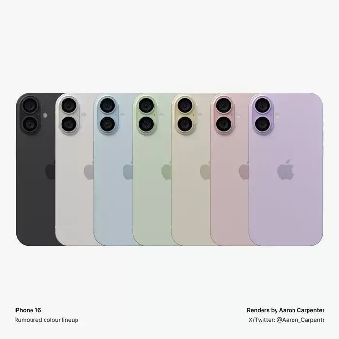 아이폰 16컬러는 전반적으로 파스텔톤으로 젊은 층을 경냥한 것으로 보여요 !! 블루,옐로우,핑크,그린,블랙,화이트,퍼플로 총 7가지로 예상되며 뒷면은 유리 재질로 파스텔톤과 반투명 효과를 더할 것으로 보여져요!!