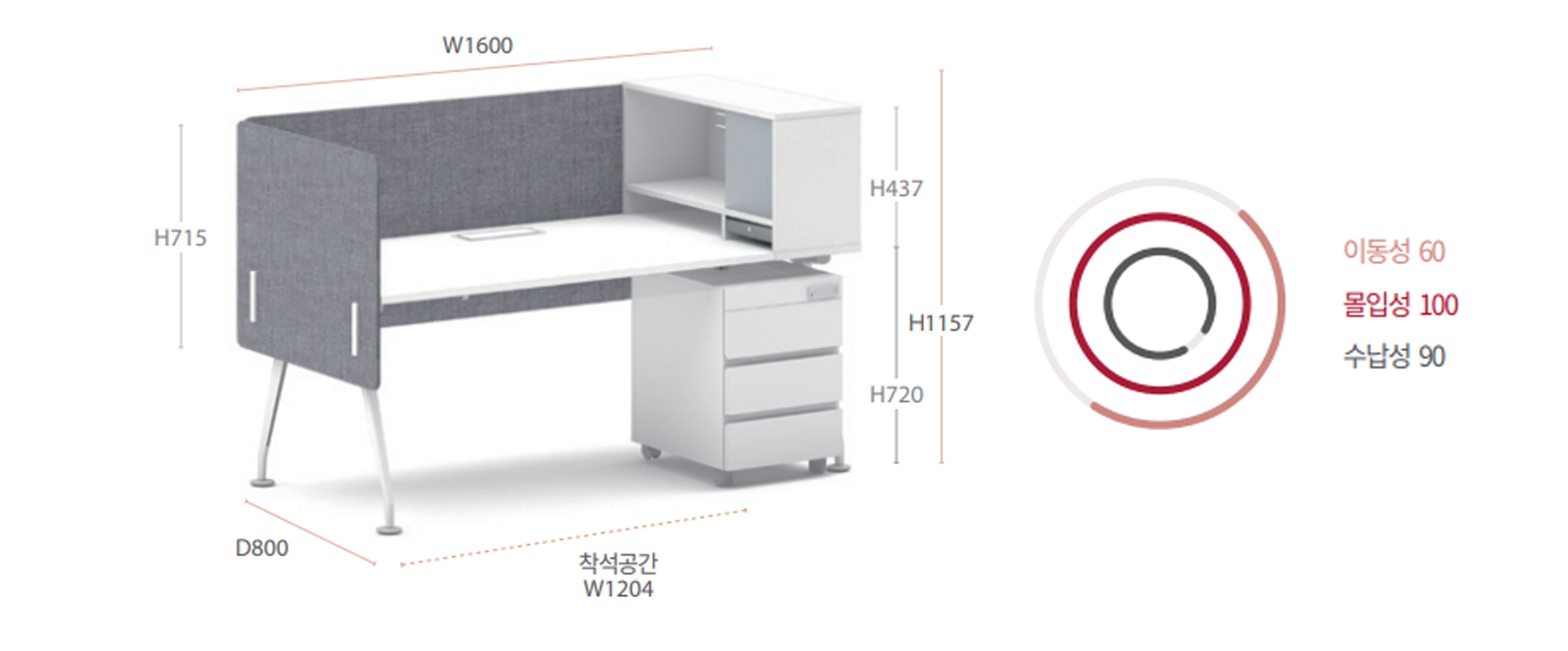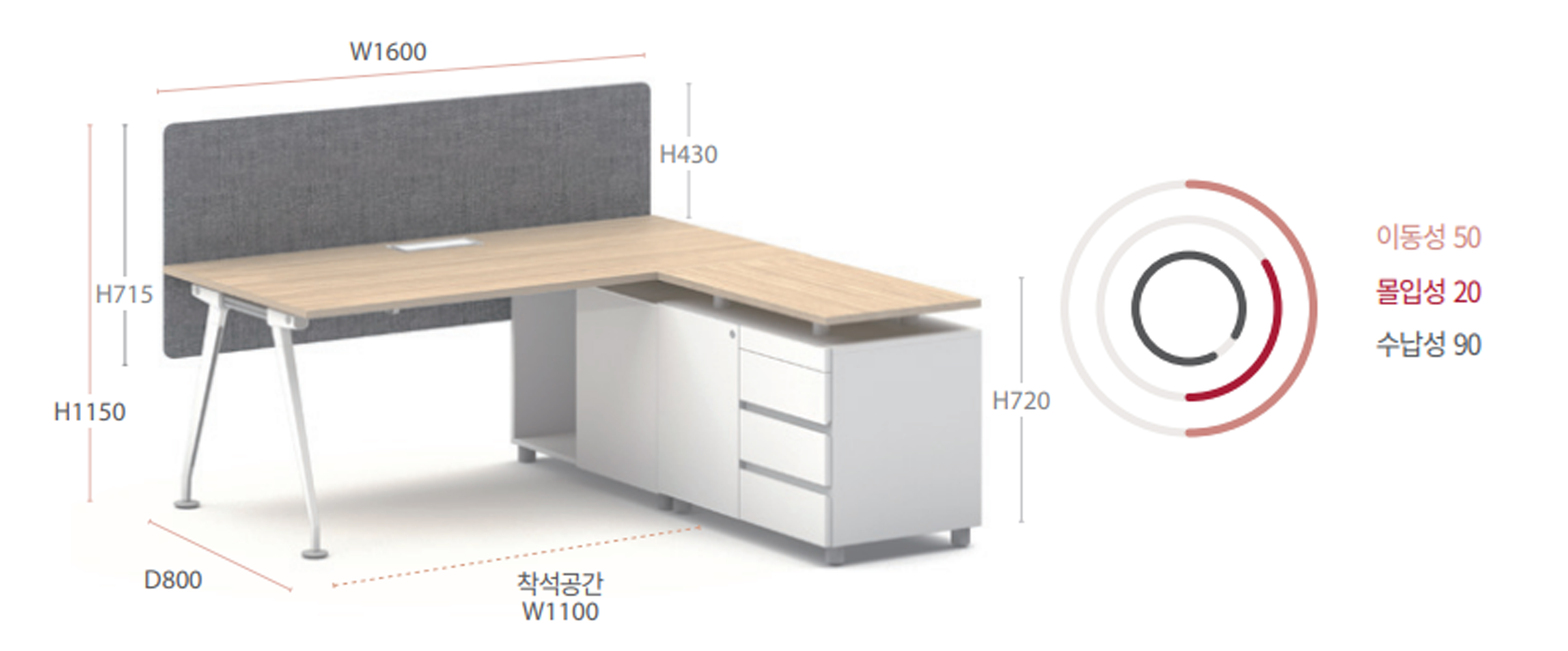 상부 캐비닛 스토리지와 조합을 통해 방대한 자료들을 효율적으로 수납 가능함과 동시에 업무공간에는 영향을 미치지 않으면서 집중도를 높여주는 수납형 모듈입니다.