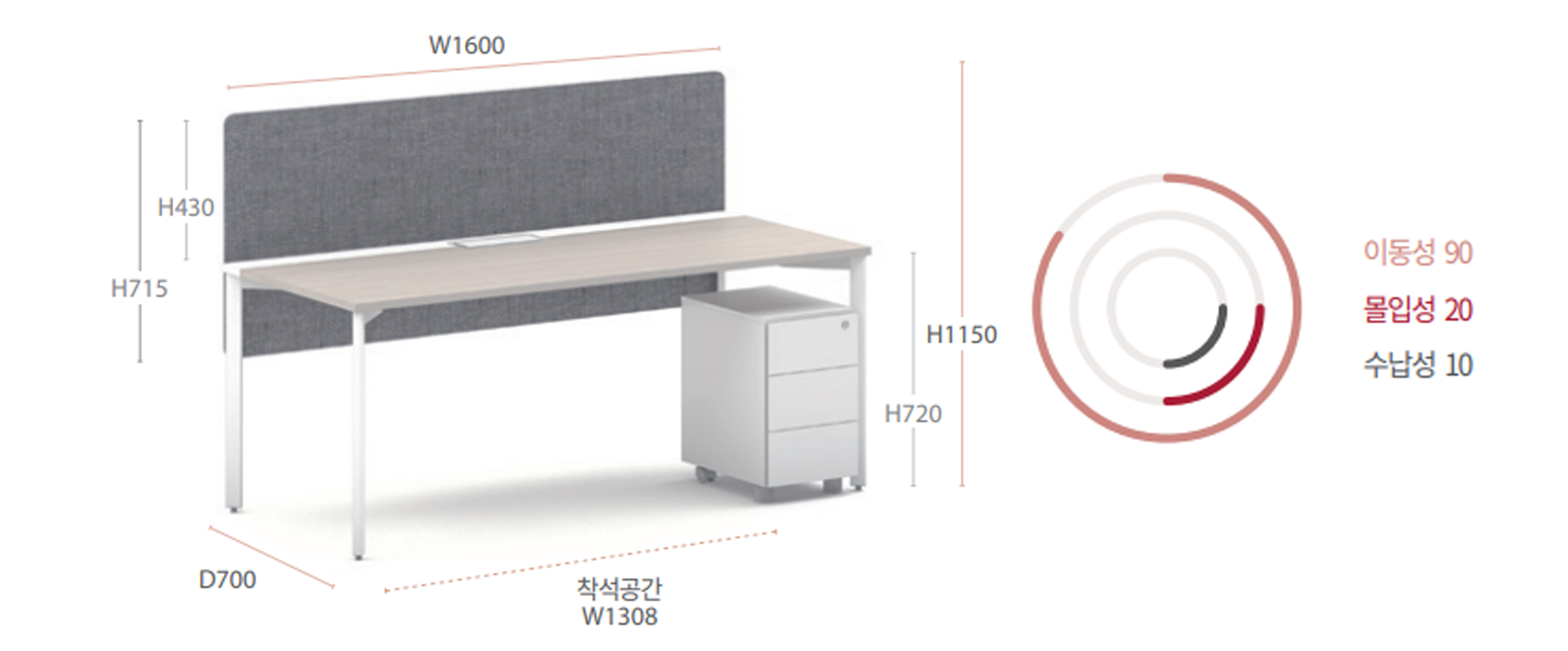 데스크와 서랍의 조합을 통해 오픈형 업무공간 및 기본 수납공간을 가지며, 잦은 레이아웃 변경에도 간편하게 이동이 가능한 기본 모듈입니다.