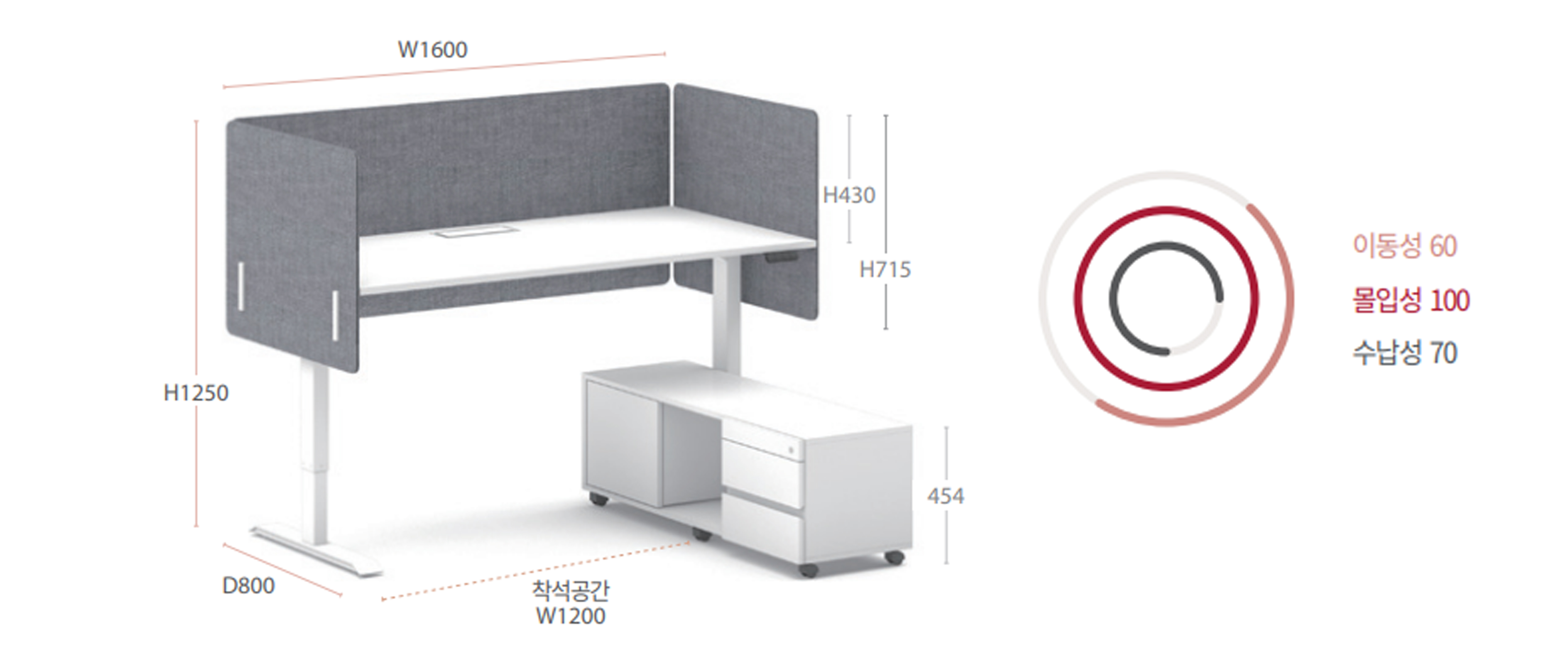 높이 조절 데스크는 사용자별 체형과 업무 환경에 따른 능동적인 공간을 구성할 수 있는 모션데스크 모듈 입니다.