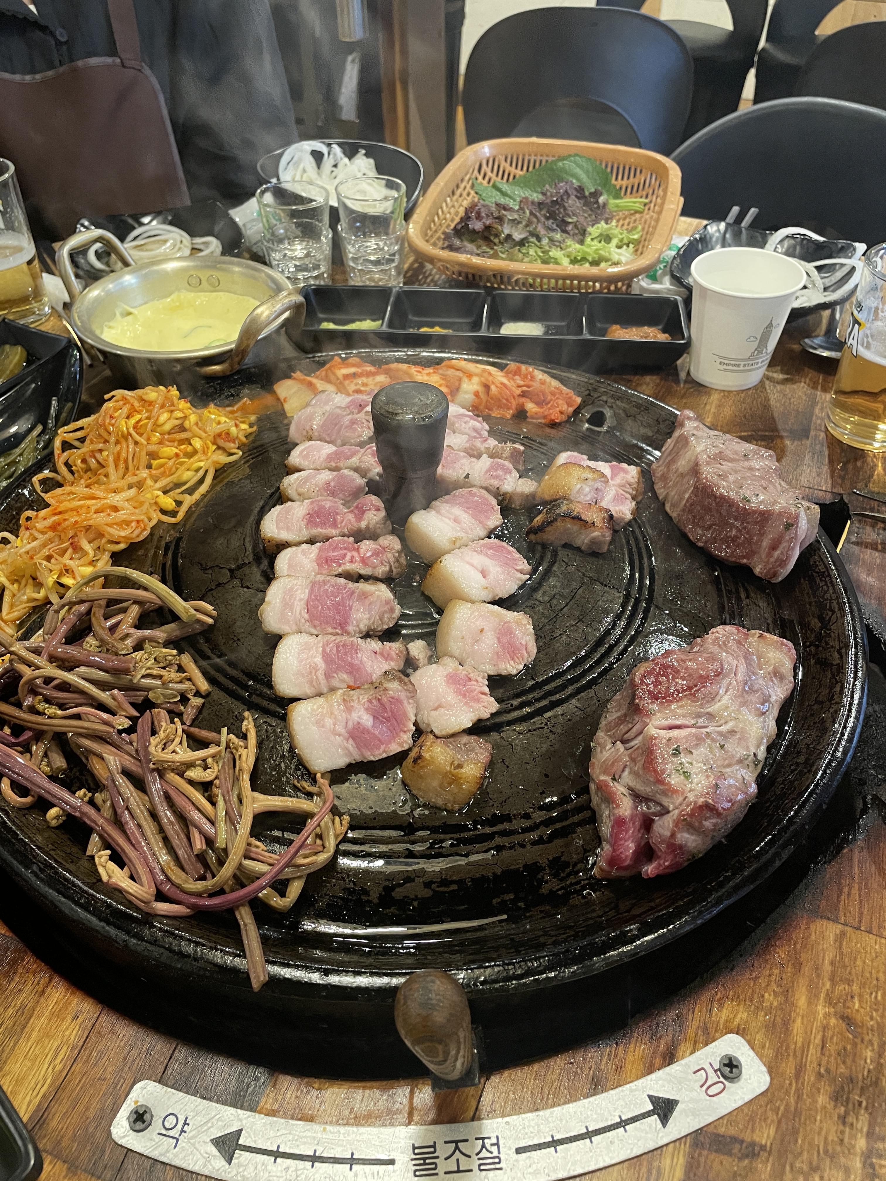 고기는 직원분께서 직접 구워주세요!!! 너무 편하고 좋아요 고기 구워주시면서 이모님과 얘기를 나누고 ㅋㅋ 약간 부담스럽게 말씀 쫙~해주시지만 듣다 보면 맛있게 먹는 방법 분위기 다 알려주셔서 좋아요!! 그리고 영수증 리뷰를 하면 서비스 주신다고 하셔서 제가 바로 했죠!! ㅎㅎ이런 건 놓칠 수 없죠!! 원래 음료수를 주시는데 저희는 이모님께 말씀 잘 드려서 입구에 있는 화로에서 고구마 구이를 할 수 있게 고구마를 서비스로 받았어요!! 헤헤 👍👍