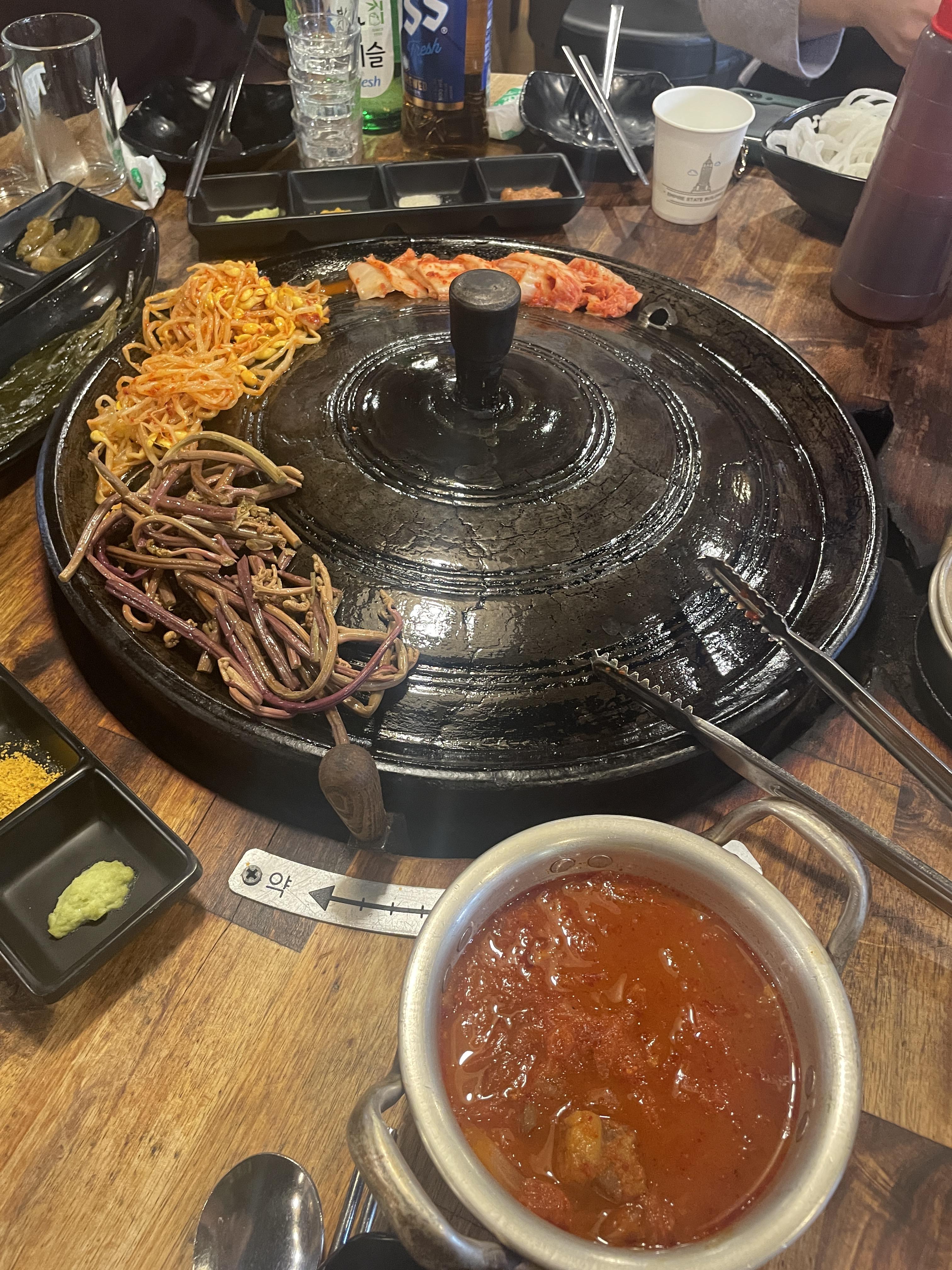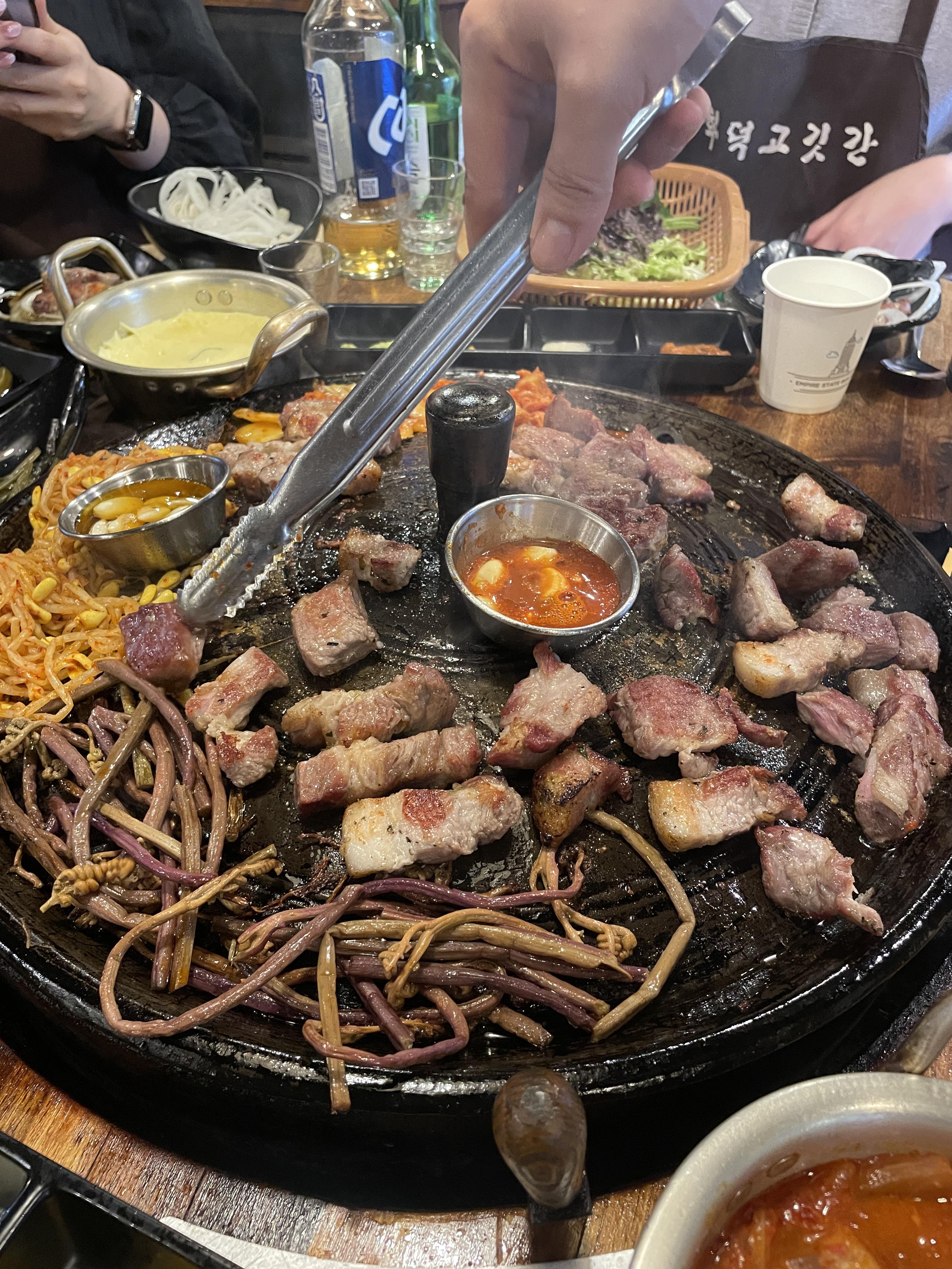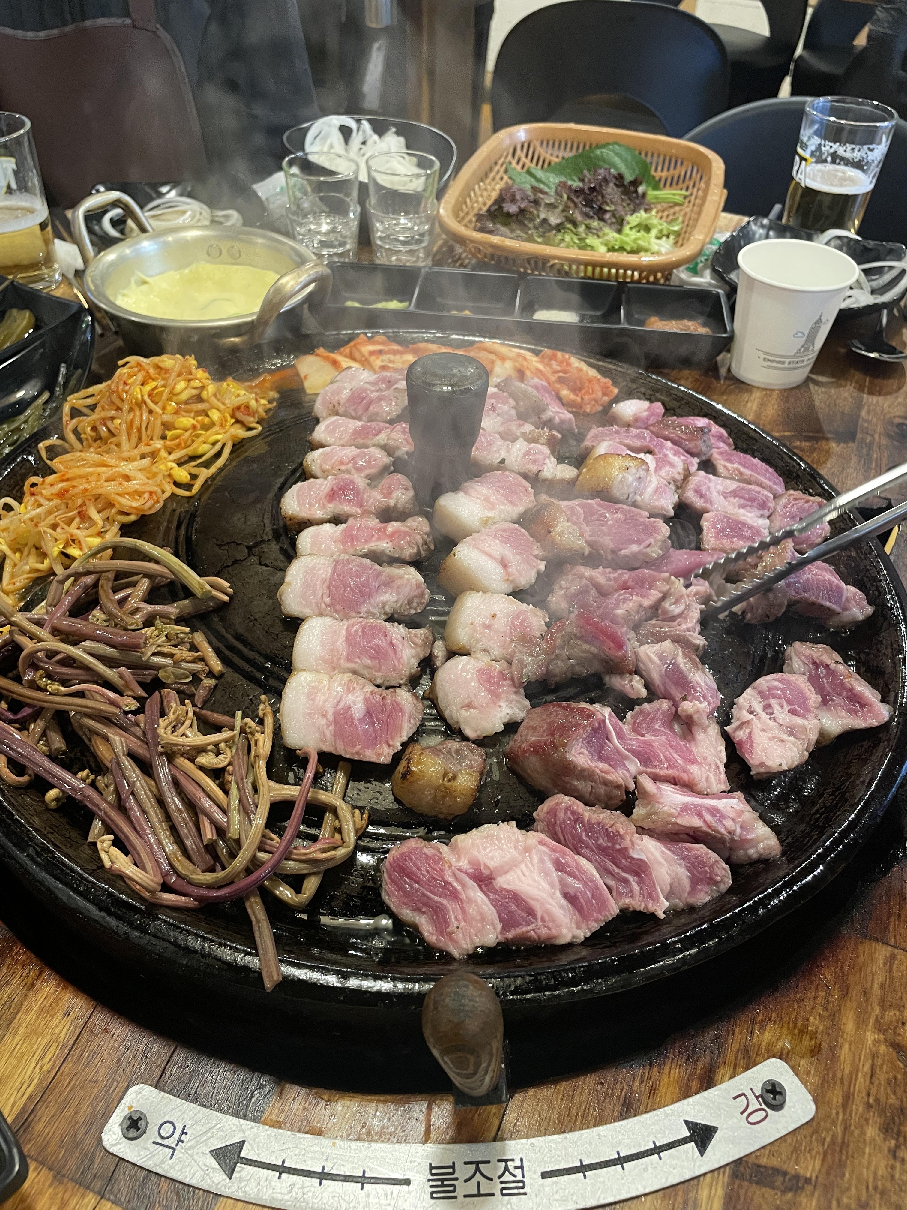 고기를 시키면 기본 세팅으로 솥뚜껑에 고사리, 김치, 콩나물을 올려주고요 양파와 쌈채소 그리고 김치찌개, 계란찜을 올려주세요!! 그리고 각종 밑반찬과 4가지의 양념소스를 올려주세요!! 사진만 봐도 또 먹고 싶네요 특히 고사리를 구워 먹는 건 별미예요!! 다른 밑반찬은 셀프바를 이용할 수 있지만 고사리는 추가로 시켜서 드셔야 해요!! 고사리구이가 일품!!👍👍