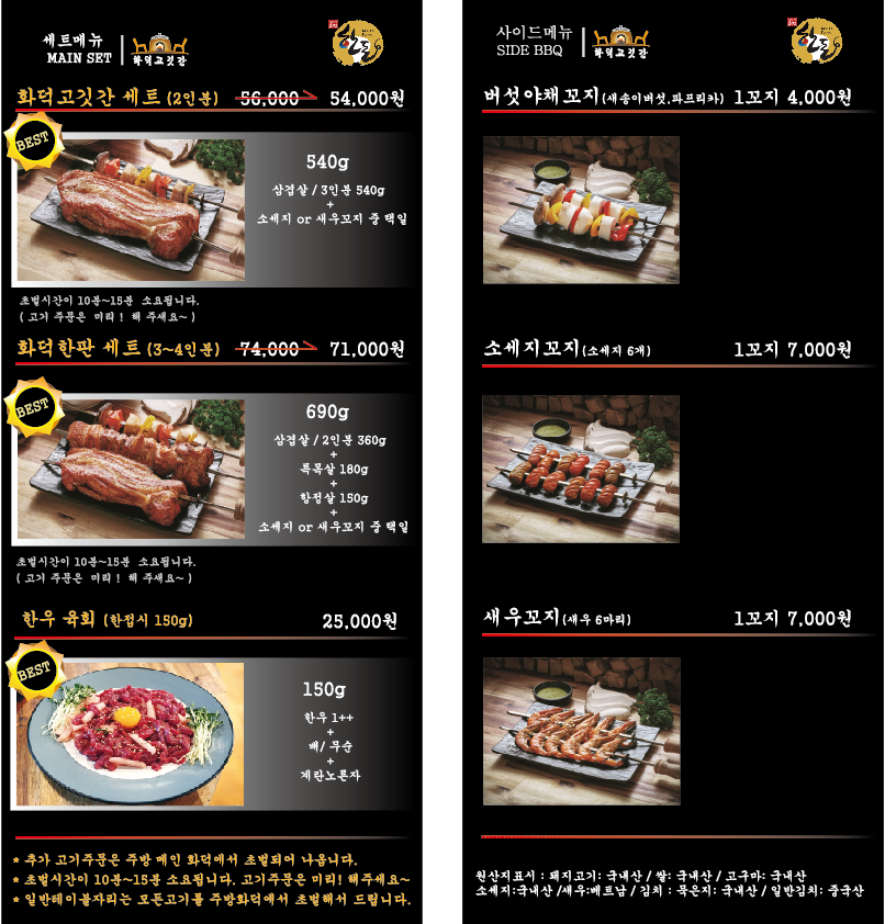 화덕고깃간은 화덕에서 초벌 해주는 컨셉으로 화덕 위에 솥뚜껑을 올려두고 솥뚜껑에서 구워 먹는 형식으로 되어있어요