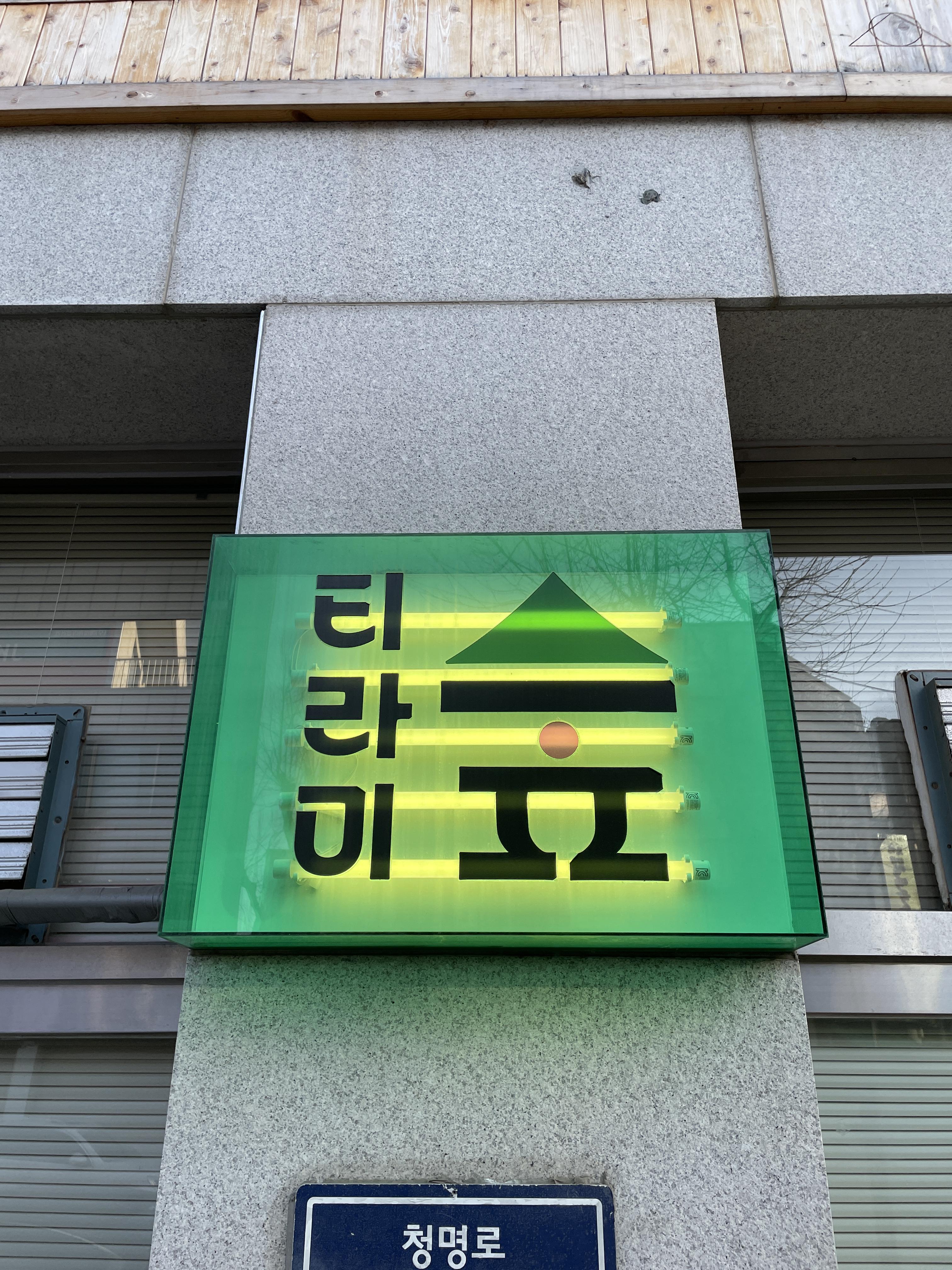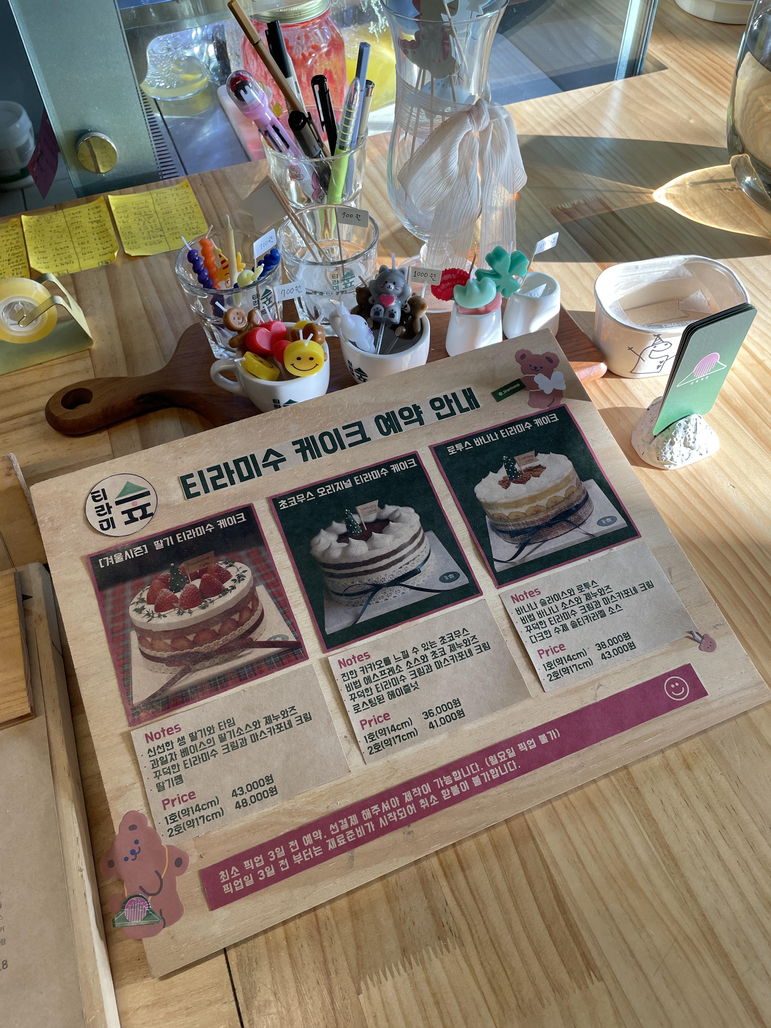 외관에서 봤을 때 티라미숲은 중간 중간 컬러유리를 사용하고 간판과 입간판도 그린계열 아크릴로 포인트를 주셔서 티라미숲의 아이덴티티가 뿜뿜했어요!!