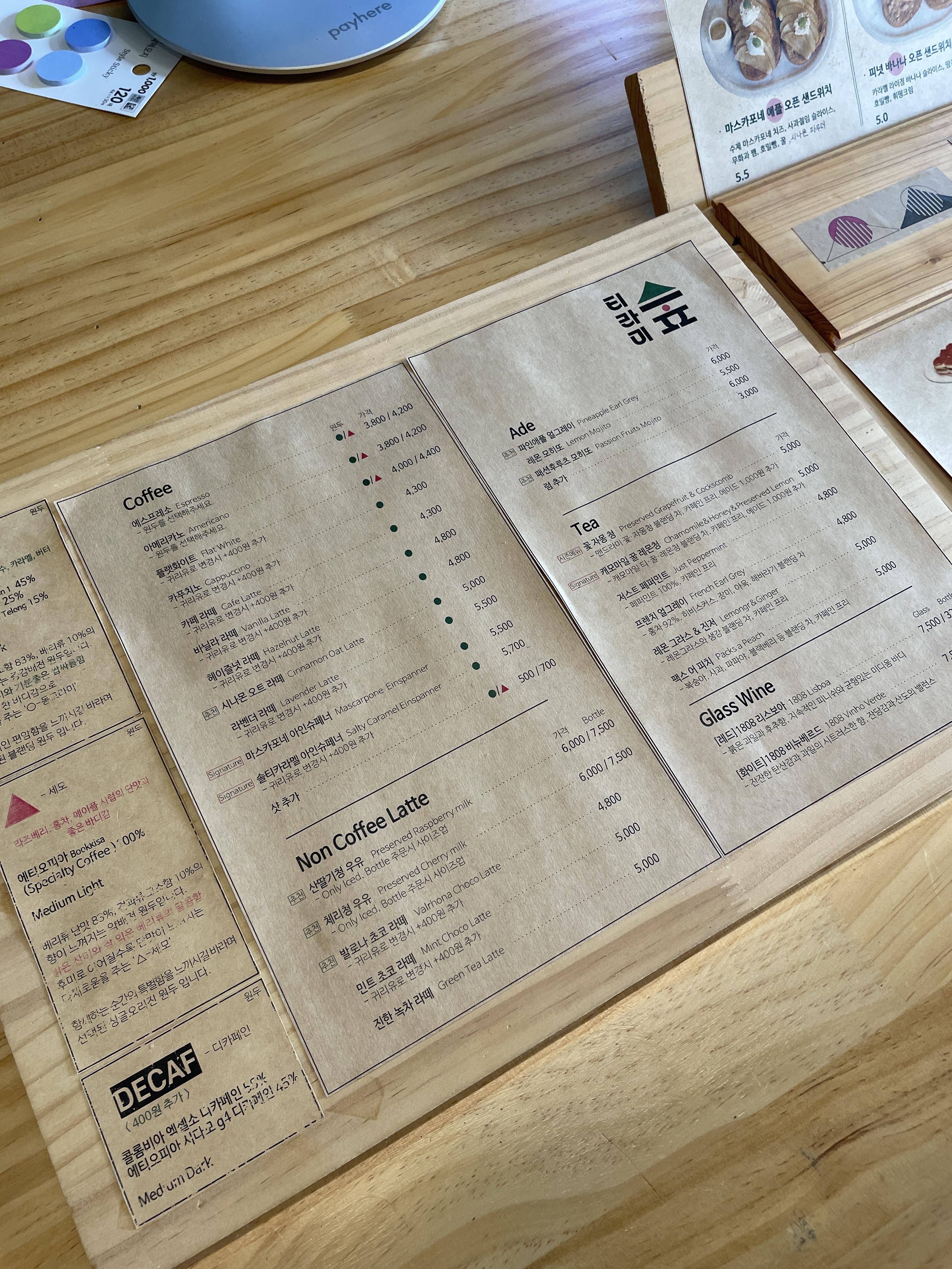 티라미숲 음료메뉴는 커피와 라테, 에이드, 티, 글라스 와인이 구성되어 있어요 티라미수 맛집답게 종류가 꽤 많았어요!!