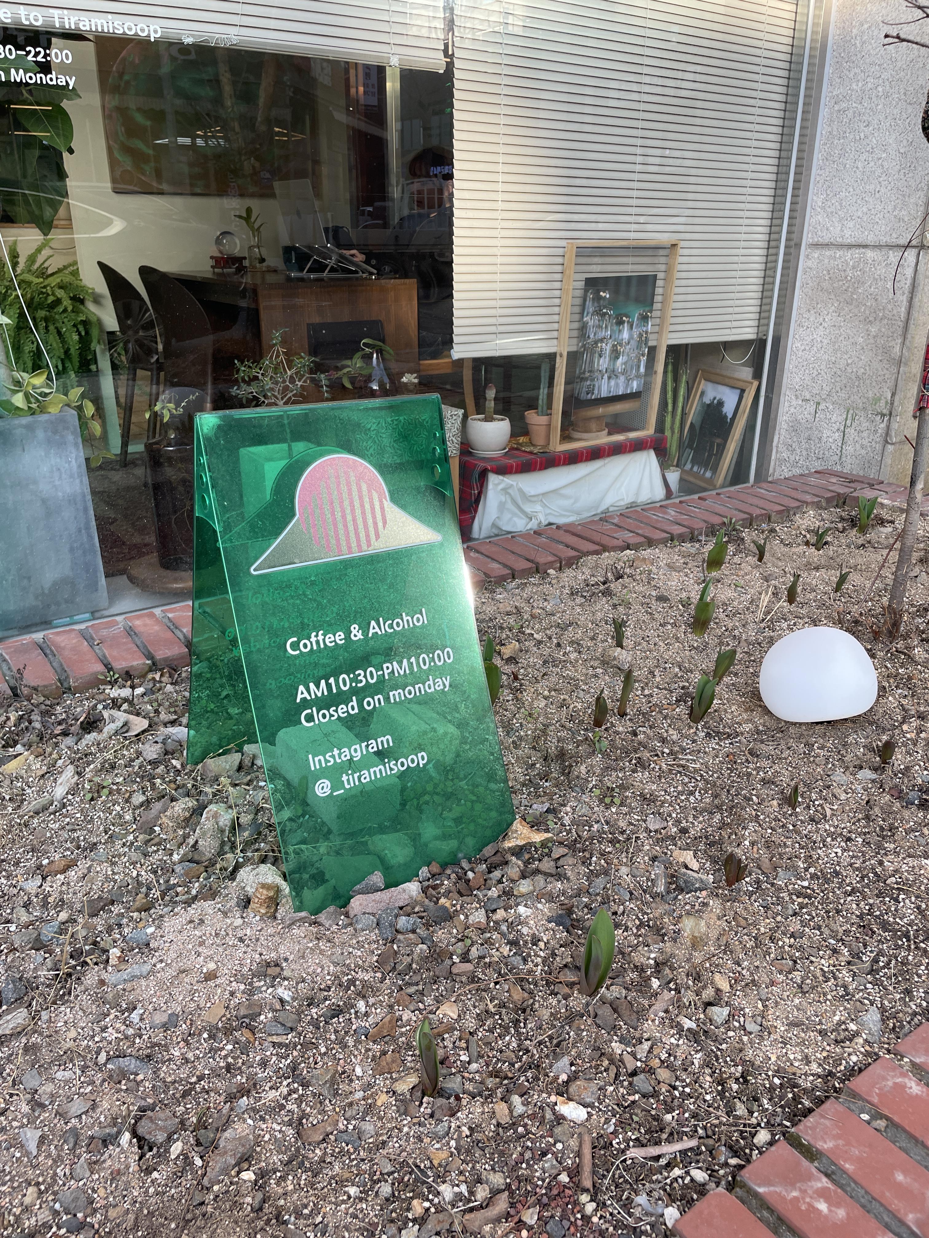 눈을 크게 뜨고 찾으셔야 한 번에 찾으실 수 있어요🙂🙂 (건물 모퉁이에 있어요!!) 그래도 공영주차장에 주차를 하고 매장 앞에 가보니깐 분위기와 개성이 뚜렷했어요🌱🌱 저는 개인적으로 간판이랑 입간판이 개성 있어서 너무 좋았어요 티라미숲의 컨셈에 잘맞게 디자인하신거 하신거 같아서 사장님이 아이디어가 좋으시다 싶었죠!!👍👍 입간판은 화단에 있어서 봄, 여름이 되면 더 이쁠거 같았어요!! 티라미숲 만의 감성이랄까요..?