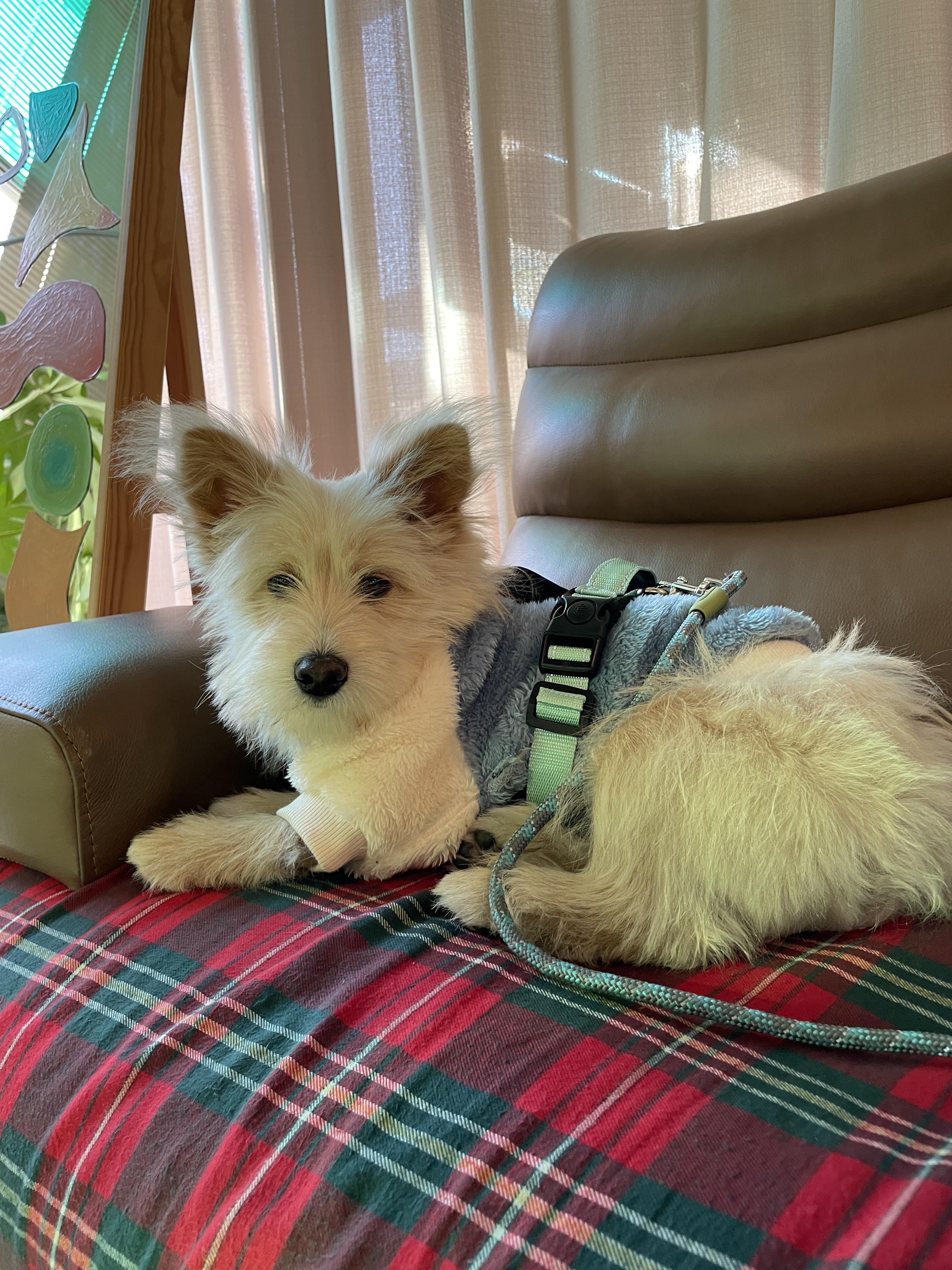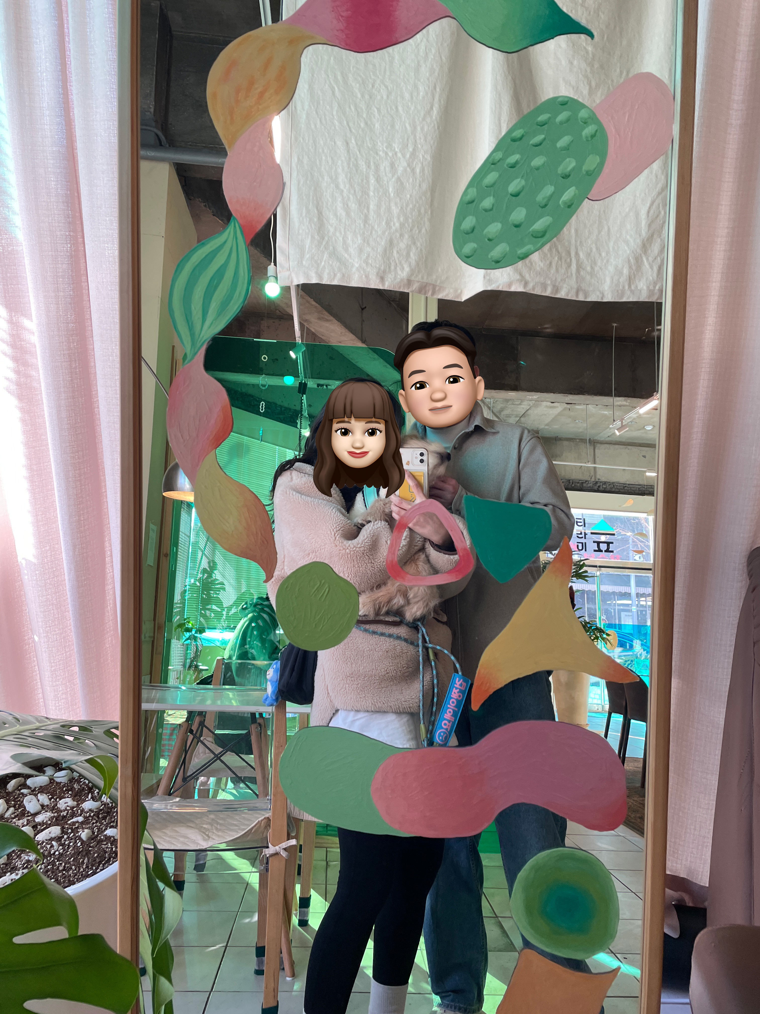 인테리어는 크게 플랜테리어로 컨셉이 잡혀있었어요🌱🌱🌱 기둥과 벽에 포인트 벽지로 되어있고 벽면에 커튼등 전체적인 인테리어가 너무 산뜻하고 감각적이었어요 😭😭 역시 인테리어는 감각의 차이인 거 같아요.. 별거 아니지만 포인트로 공간이 살고 죽냐 차이인 거 같아요!! 그게 고급 스러은 마감재를 사용하지 않더라도 포인트의 소재 콘셉트를 잘 표현한다면 그 누가 오더라도 호불호가 강하지 않는 거 같아요!! 애견 동반 카페라 그런지 반려견 수건, 방석도 같이 배치되어 있어서 배려가 느껴졌어요!! 룽지도 카페에 들어오자마자 여기저기 둘어보면서 킁킁하면서 자기가 원하는 자리를 딱 잡았어요
