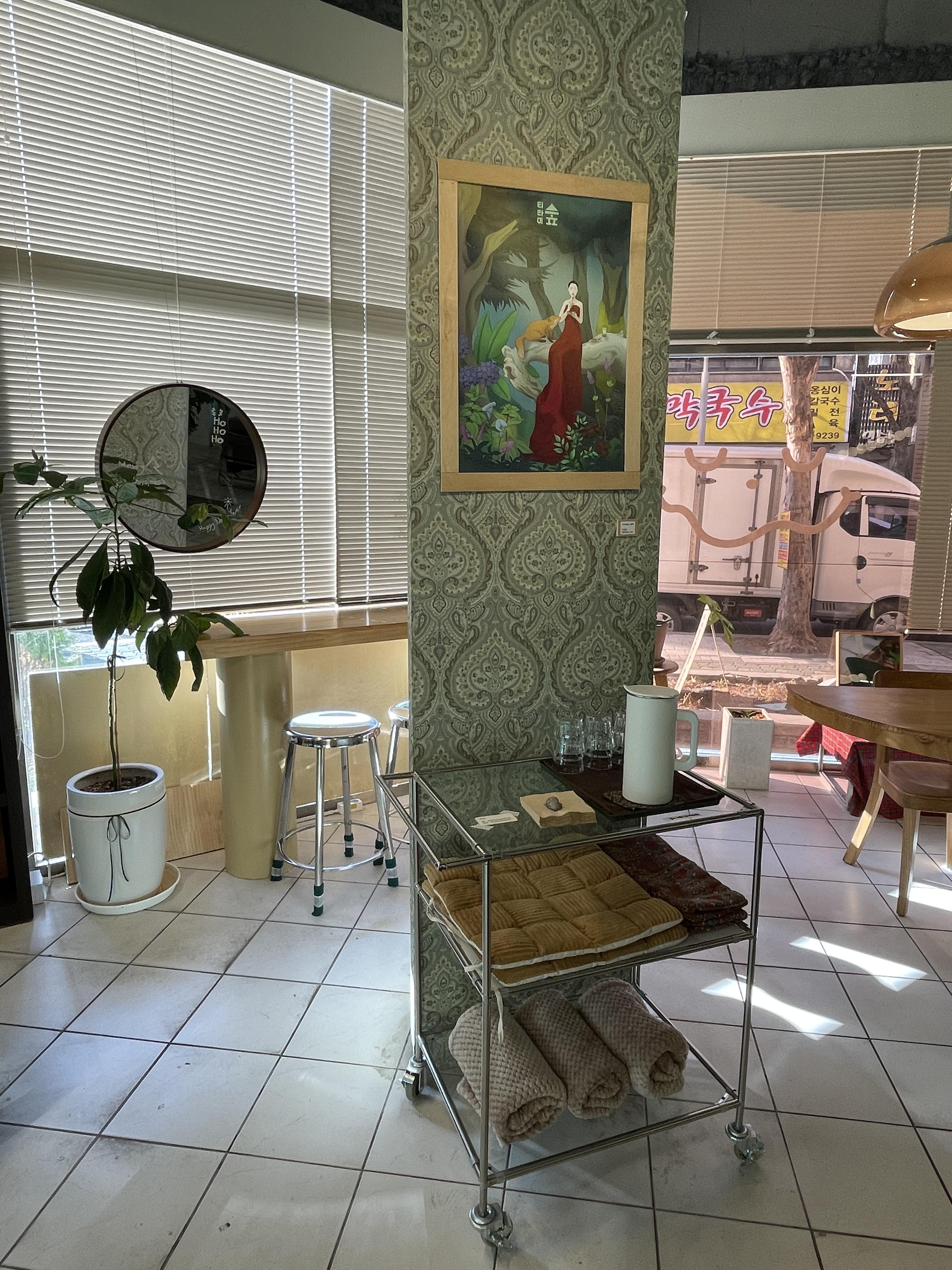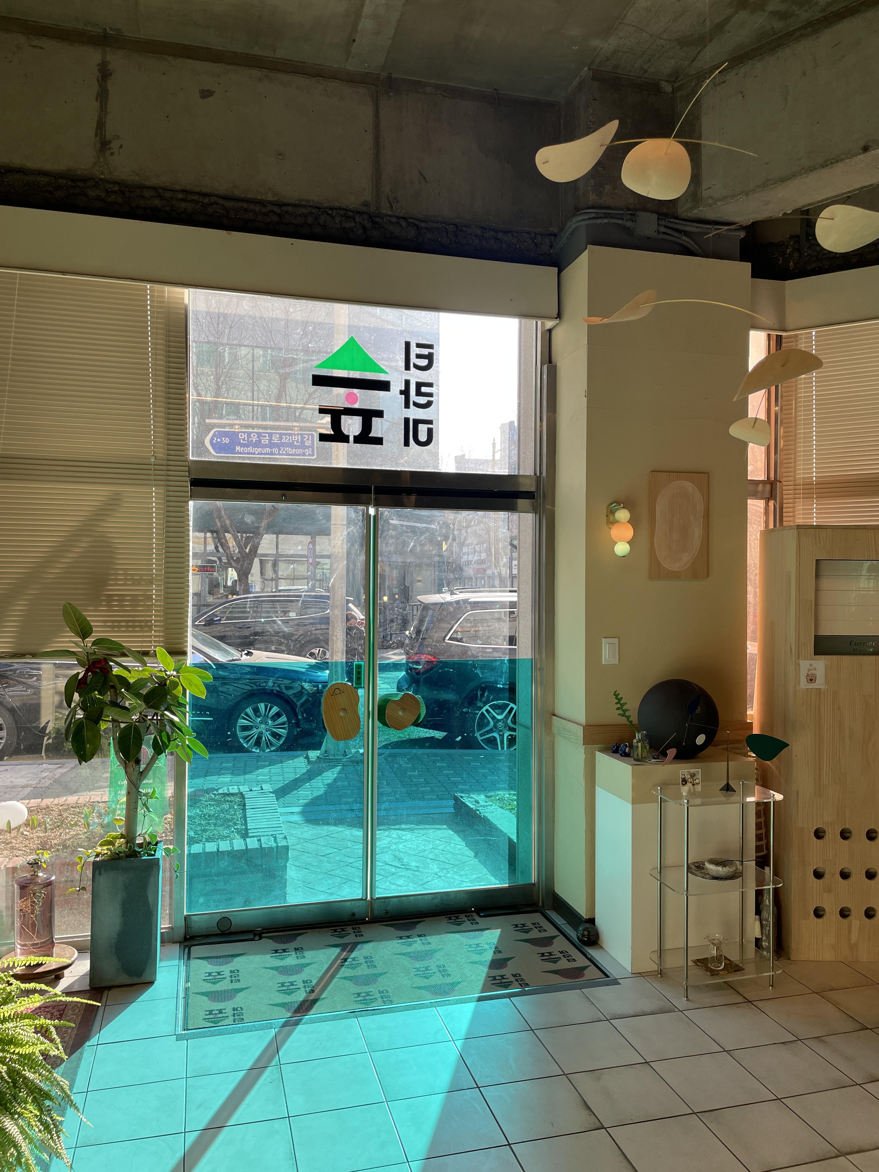 유리를 그린계열로 시트작업 하고 포인트 유리파티션을 세워서 밖에서 빛이 통과될 때 그린컬러로 비치고 반사되는 빛의 효과가 영롱합니다!! 의도하신 건지는 모르겠지만 빛 효과도 티라미숲의 컨셉을 한층 더 높요 주고 있네요👍👍