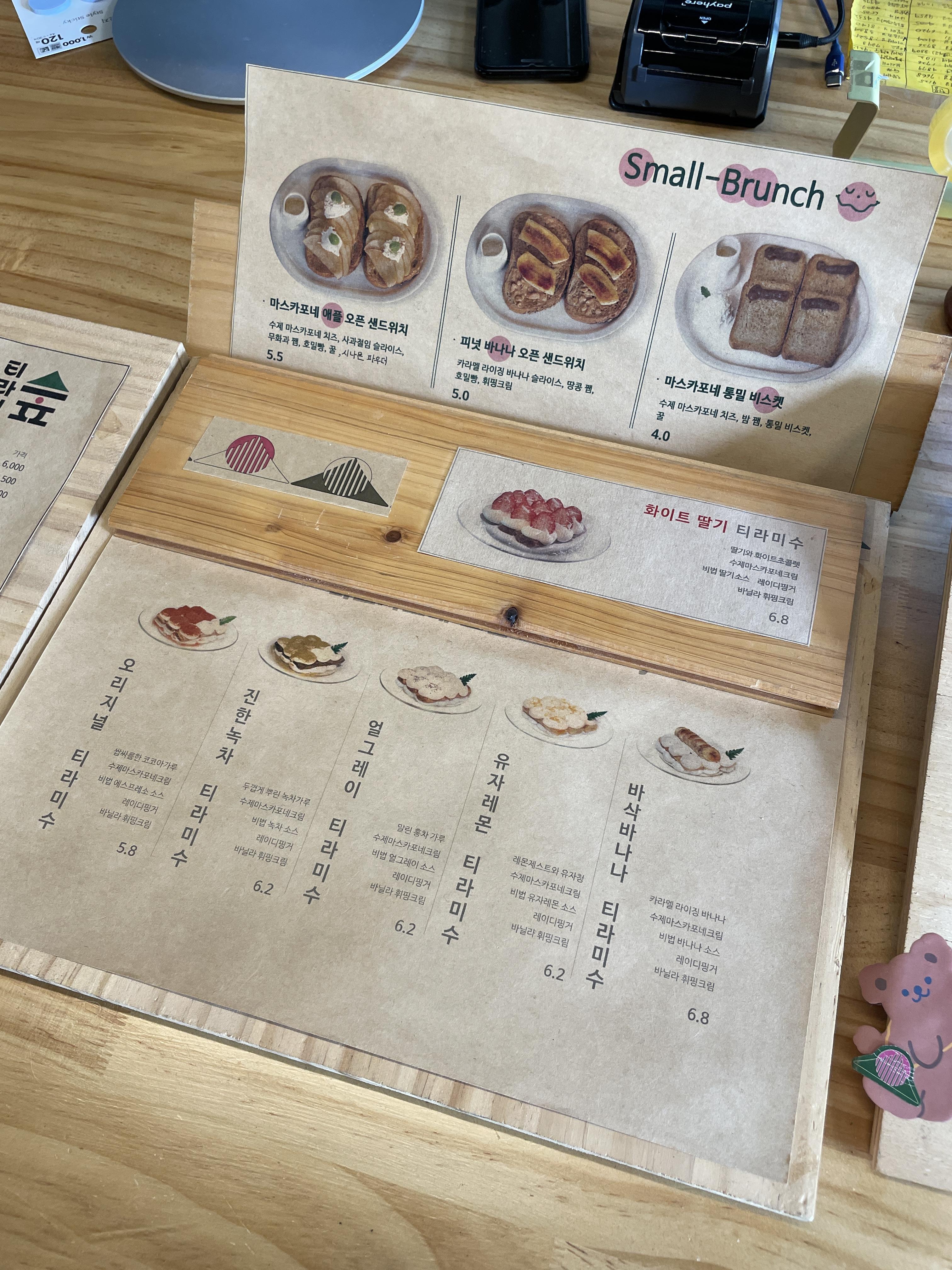 오리지널, 진한 녹차, 얼그레이, 유자레몬, 바삭 바나나 티라미수가 있고 계절 한정 메뉴인 화이트 딸기 티라미수도 있어요!! 그리고 스몰브런치도 있어요 마스카포네 애플 오픈 샌드위치와 피넛 바나나 오픈 샌드위치, 마스카포네 통밀 비스킷이 있어요 정말 다 맛있어 보였어요 ㅠㅠ 조금씩 먹어보고 싶었어요 그리고 티라미수 케이크도 주문 가능해요!!