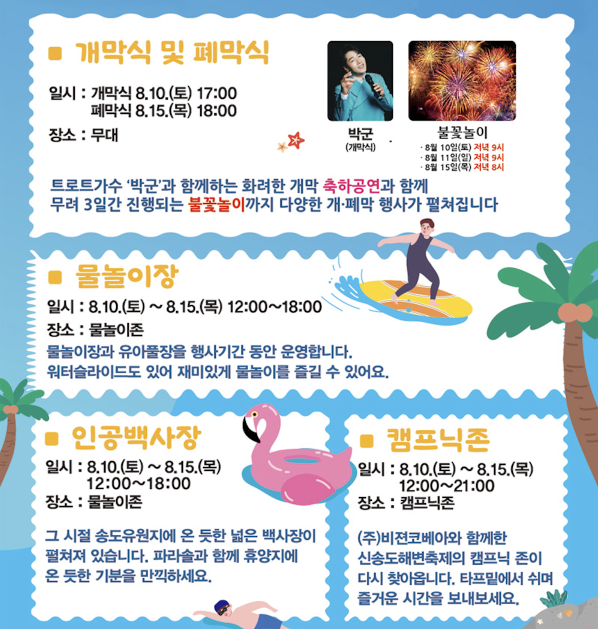 개막공연 / 물놀이 / 인공해변 / 캠프닉 / 스포테인먼트 / 푸드트럭