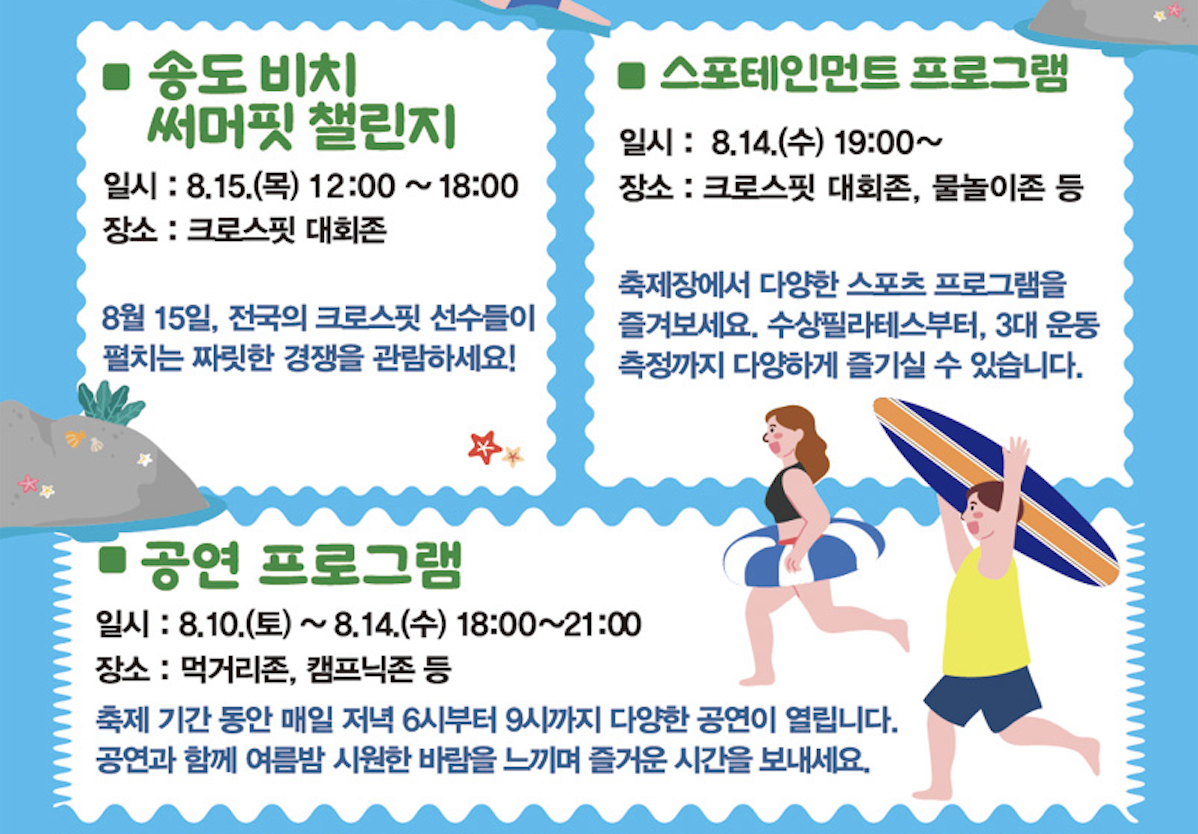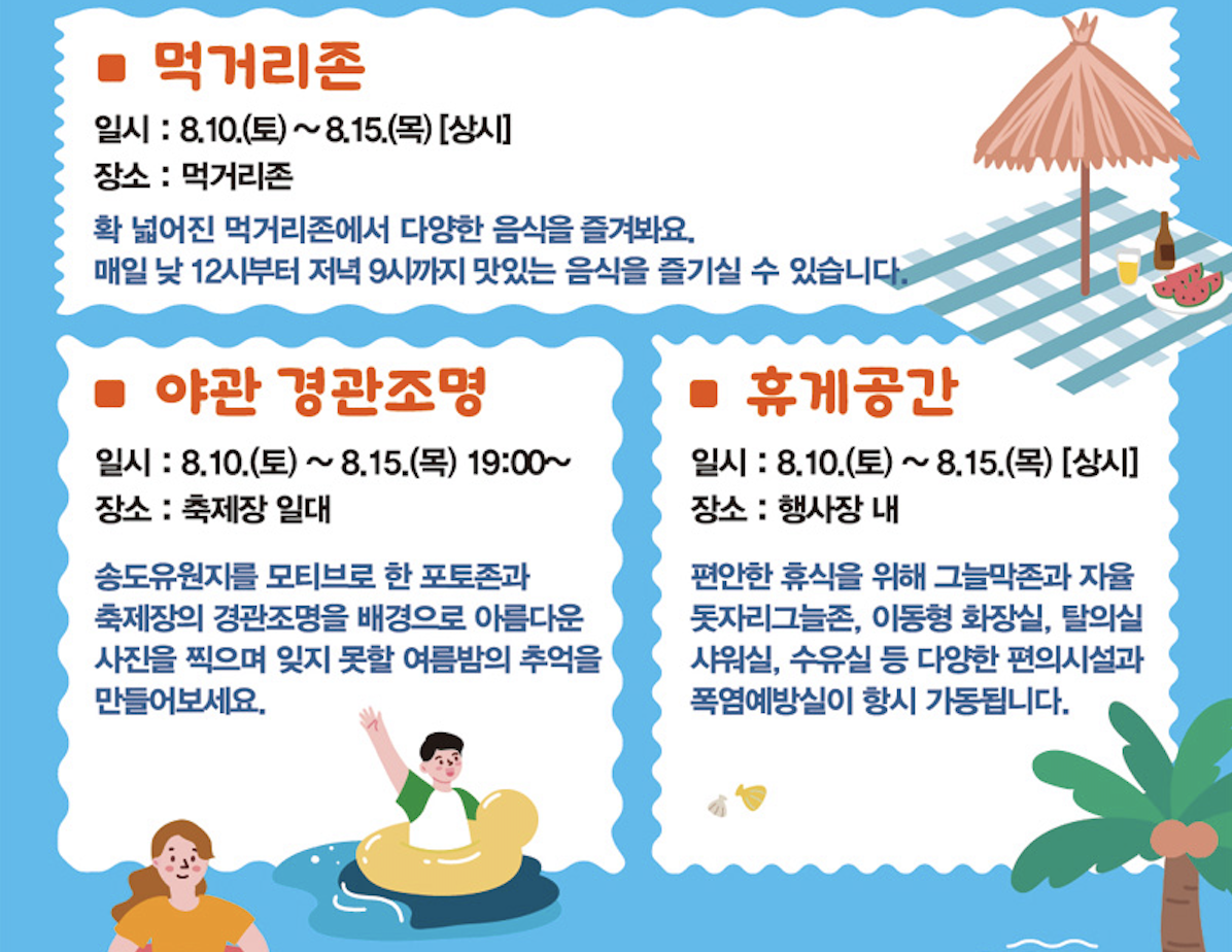어린이물놀이장, 인공백사장, 캠크닉존에서 다양한 레크레이션과 체험 프로그램과 송도유원지의 추억을 되살릴 수 있는 레트로 게임등 다양한 세대공감 튜트로존이 운영된다고 해요!! 그리고 버스킹, 야외극장, 야간경관등 한여름밤을 즐길 수있는 다양한 프로그램들이 마련되어 있다고 하네요!! 전 벌써부터 기대하고 있어요!!