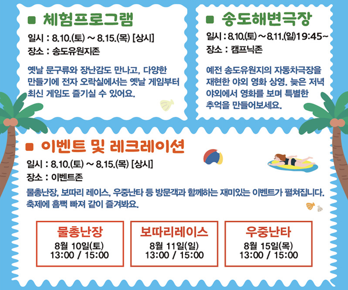 어린이물놀이장, 인공백사장, 캠크닉존에서 다양한 레크레이션과 체험 프로그램과 송도유원지의 추억을 되살릴 수 있는 레트로 게임등 다양한 세대공감 튜트로존이 운영된다고 해요!! 그리고 버스킹, 야외극장, 야간경관등 한여름밤을 즐길 수있는 다양한 프로그램들이 마련되어 있다고 하네요!! 전 벌써부터 기대하고 있어요!!