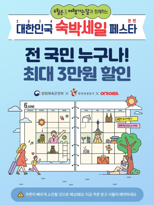 한국관광공사와 문화체육관광부에서 진행하는 여행가는달과 함께하는 2024 대한민국 숙박세일페스타는 기간 동안 선착순으로 숙박 할인 쿠폰을 발급하고 있어요!!