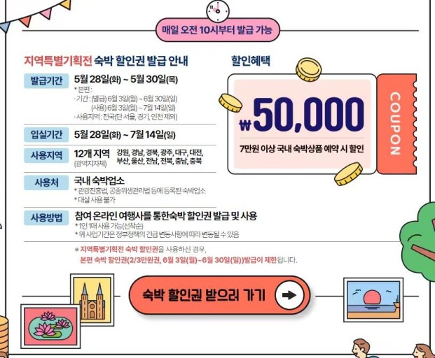 현재 5월 28일부터 30일까지 3일간 진행 했던 4.5만 장의 지역특별기획전 쿠폰발급은 종료되었었고 2024 6월 3일부터 본편이 시작 되고 있으니깐 이번 기회를 놓치지 말고 꼭 여행 다녀오셨으면 좋겠어요!!